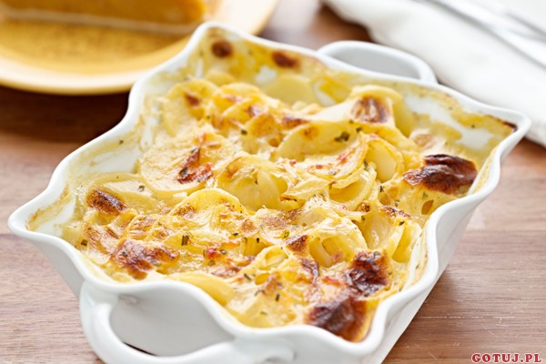 Ziemniaki obrać a następnie pokroić w cienkie plasterki i włożyć do natłuszczonego, żaroodpornego naczynia. Ziemniaki posolić oraz posypać pieprzem.
